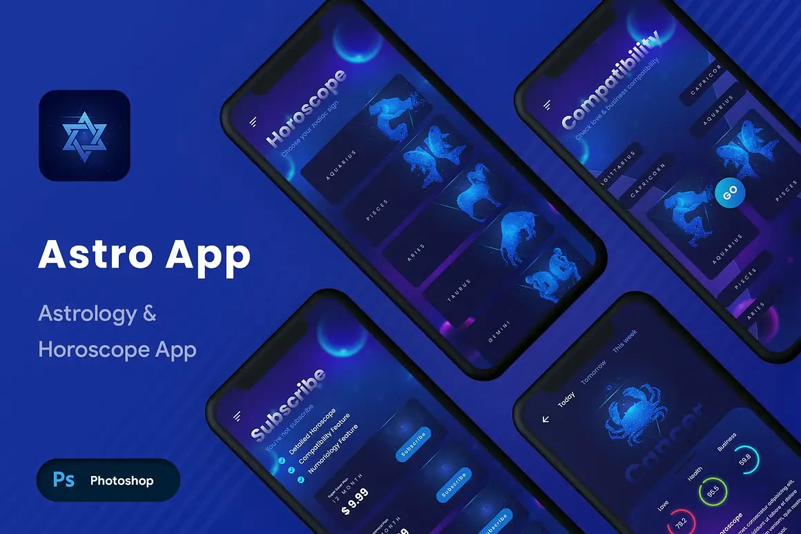 Source files: https://creativemarket.com/OpusLabWorks/7439509-Astrology-App-Horoscope-App-UI-Kit